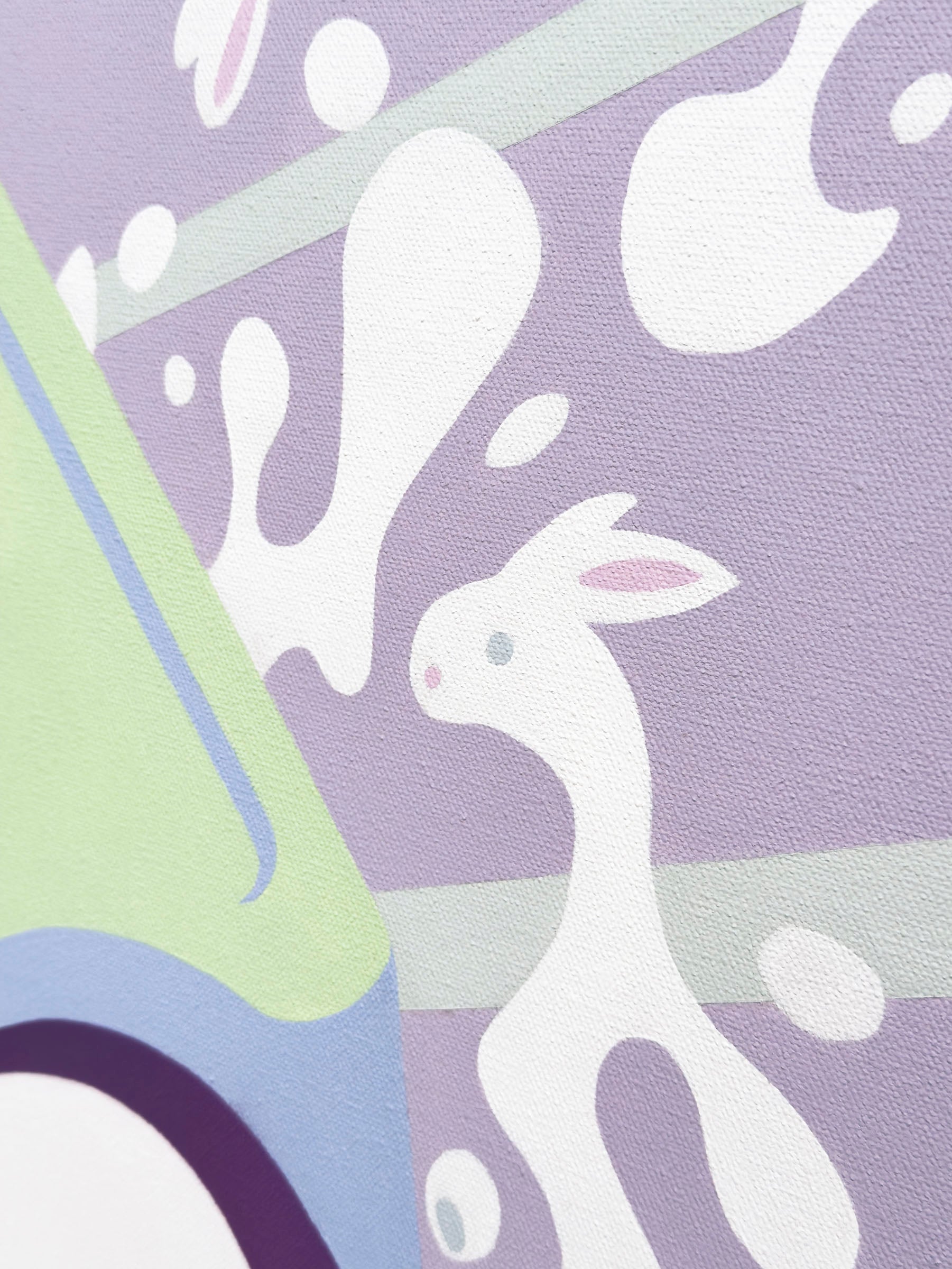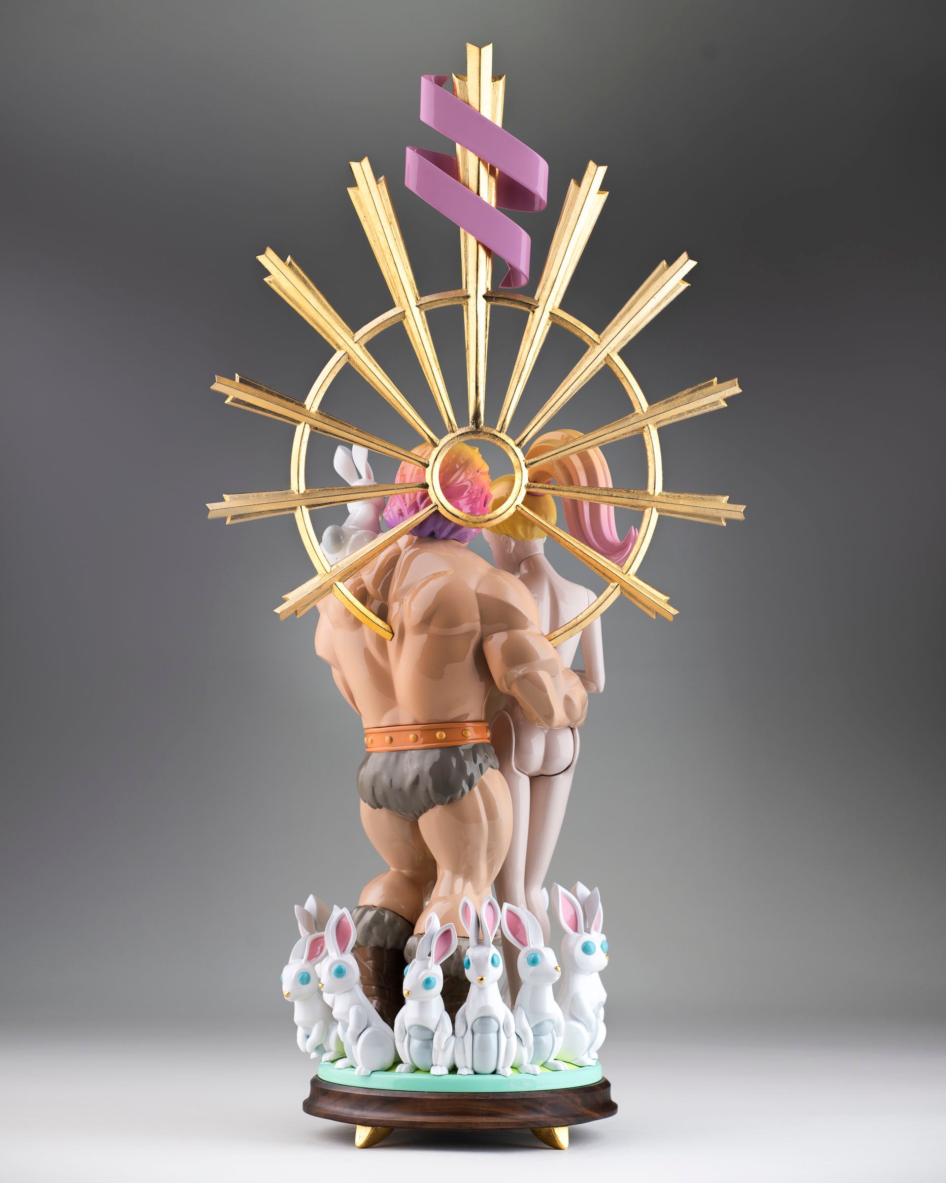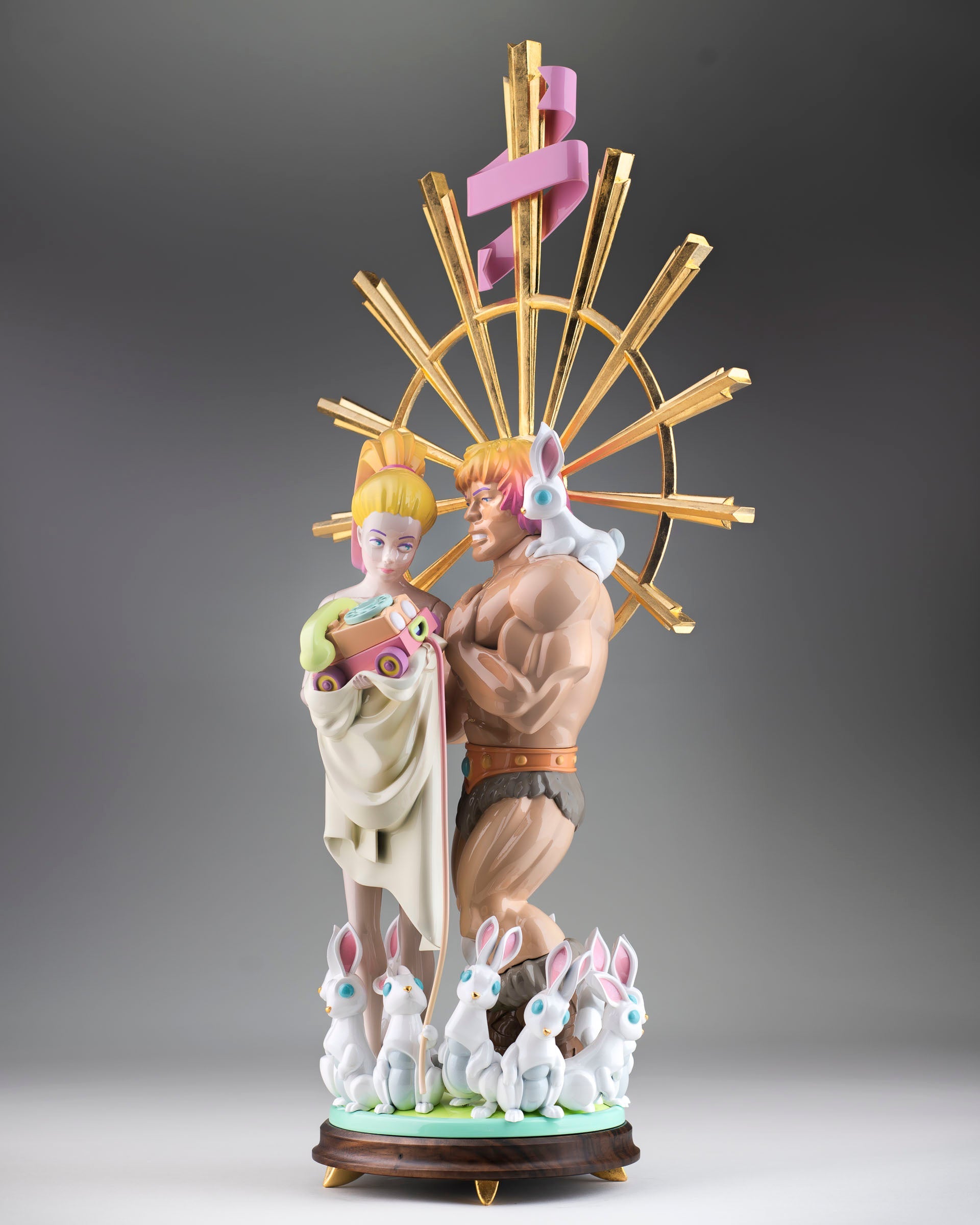 Our Miracle on Eternia series is an altar to the idea that playing with toys allows us to invent our own narratives and, in effect, create new life. Barbie and He-Man are together on his home planet with their child, and twelve curious coarse rabbits have come to inspect and protect this sacred moment. This is a family portrait, one that unites characters whose storylines don’t intersect until our inner child decides that they do.