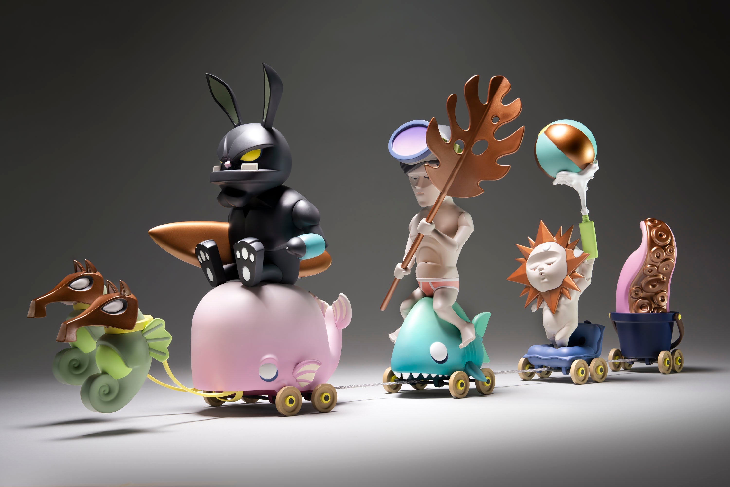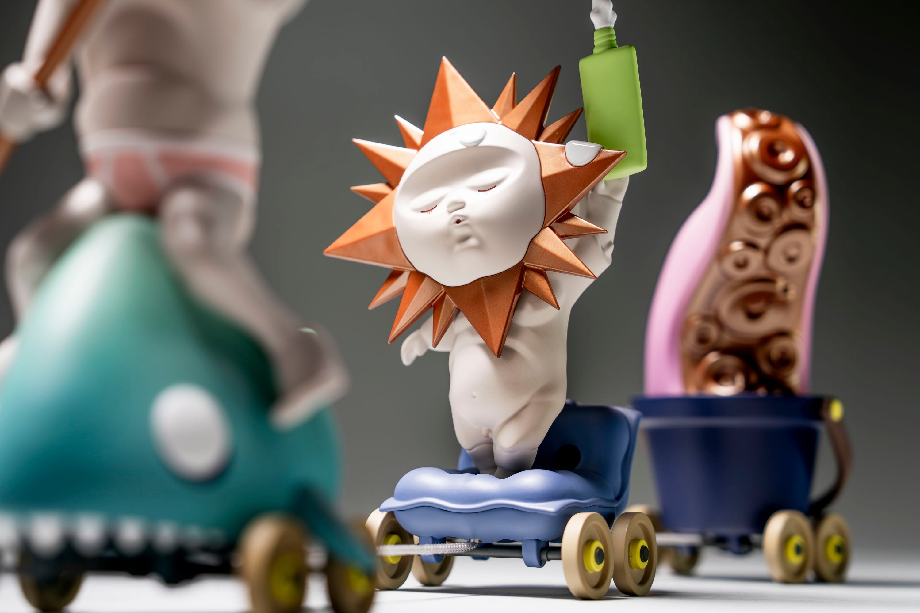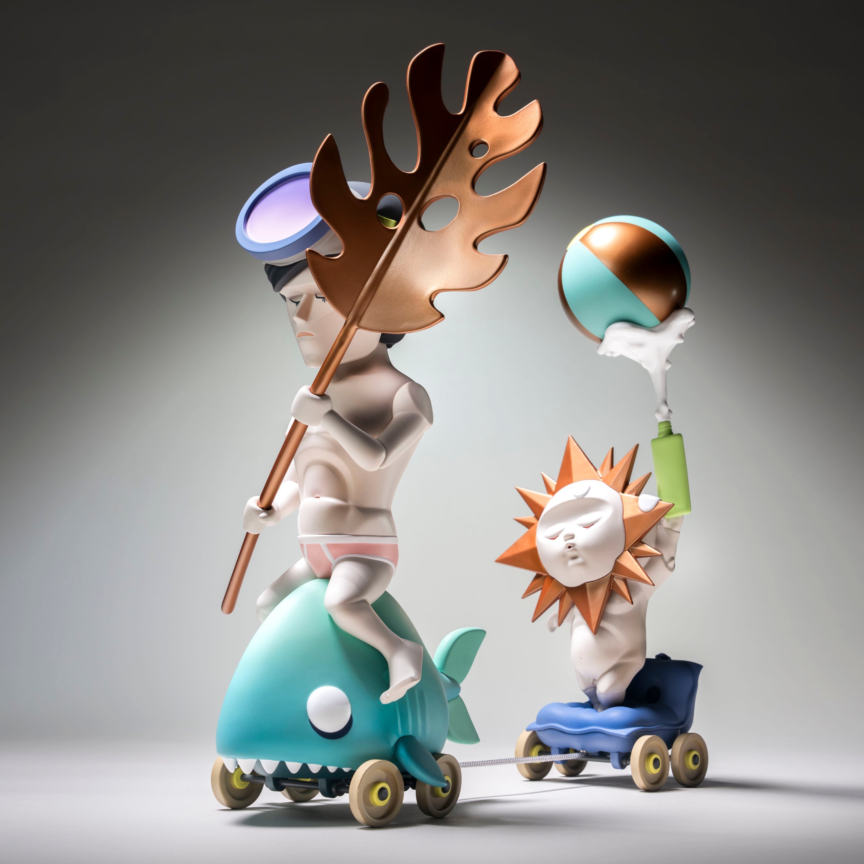 Sun and noop venture off together on a turquoise fish and an inflatable chair. All his life Sun has watched other creatures lie in the sand to enjoy his light, and now he will finally do the same. The sun above doesn't shine as brightly now that one of its rays is on the ground, but noop's golden frond still shimmers in the light.
