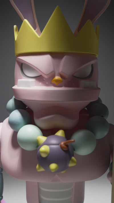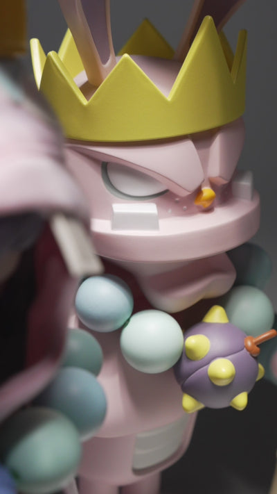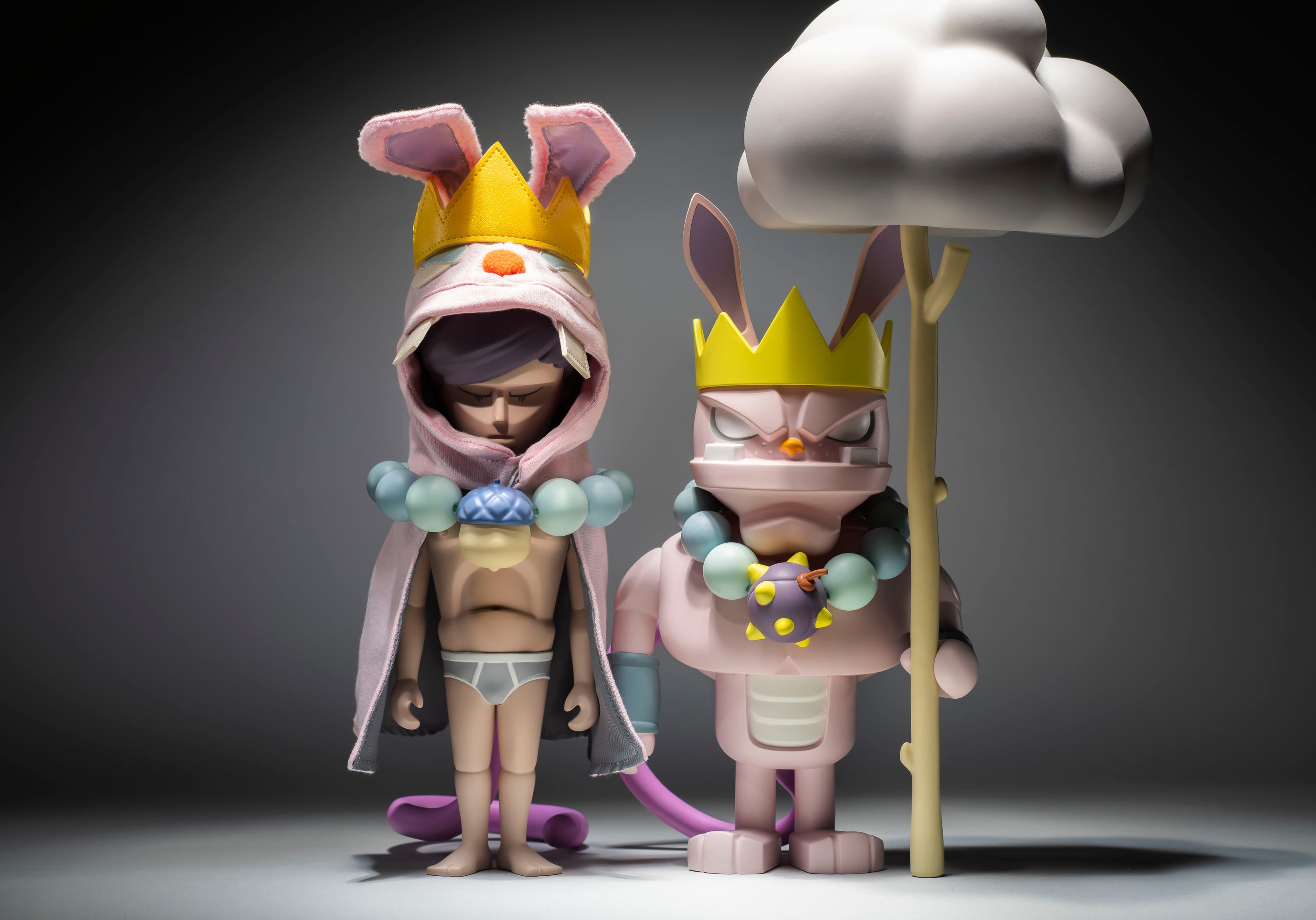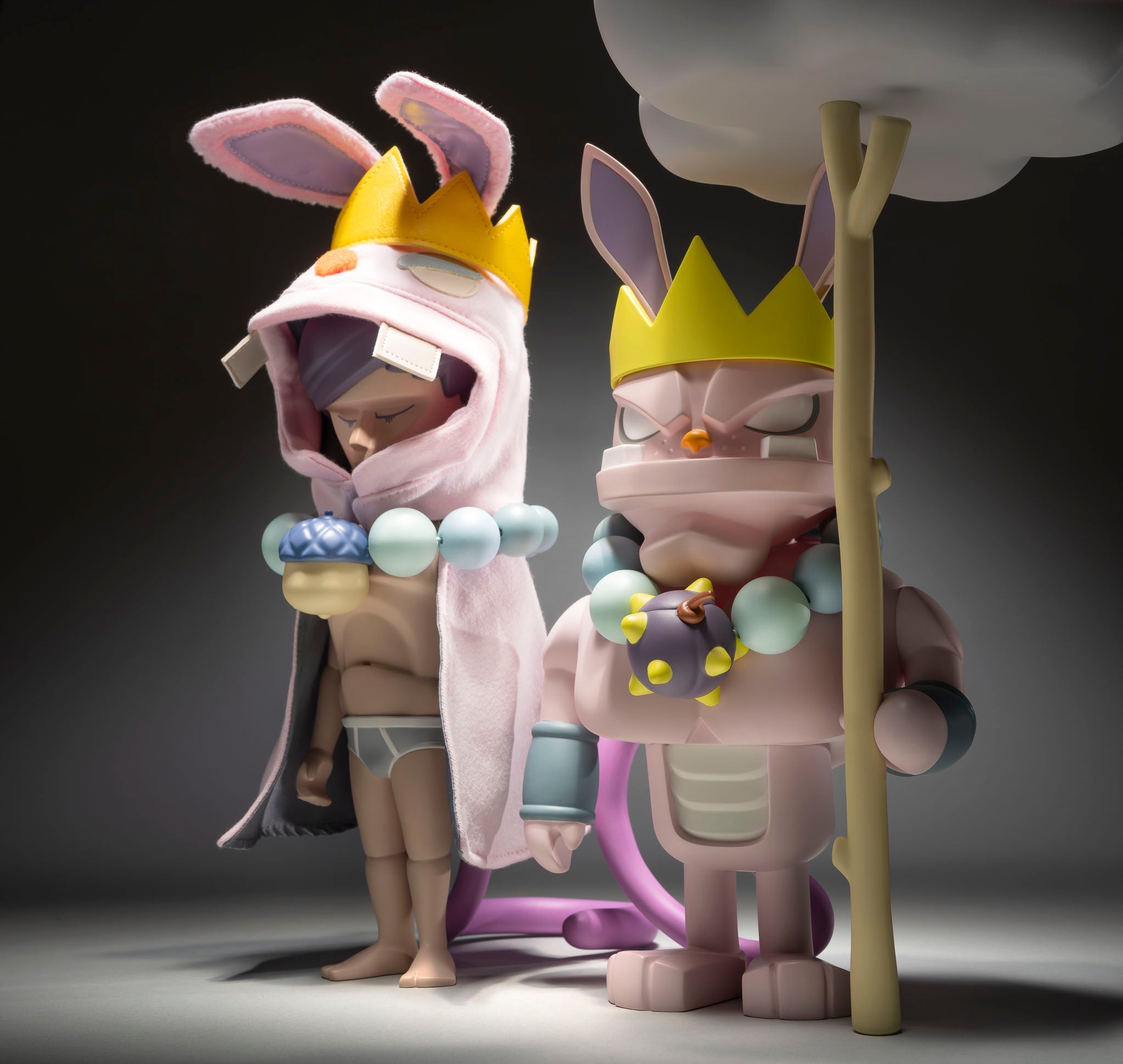 In collaboration with the global designer toy brand Pop Mart, Royal Blush [Edition of 199] finds the iconic duo in regal pastel pinks. Each order includes paw! reigning supreme with his floating-cloud scepter [13.5"], noop trying his best to be regal with a fabric monkeyking cape and crown designed by the artist Flat Bonnie, and removable necklaces made from the finest nuts their kingdom has to offer.